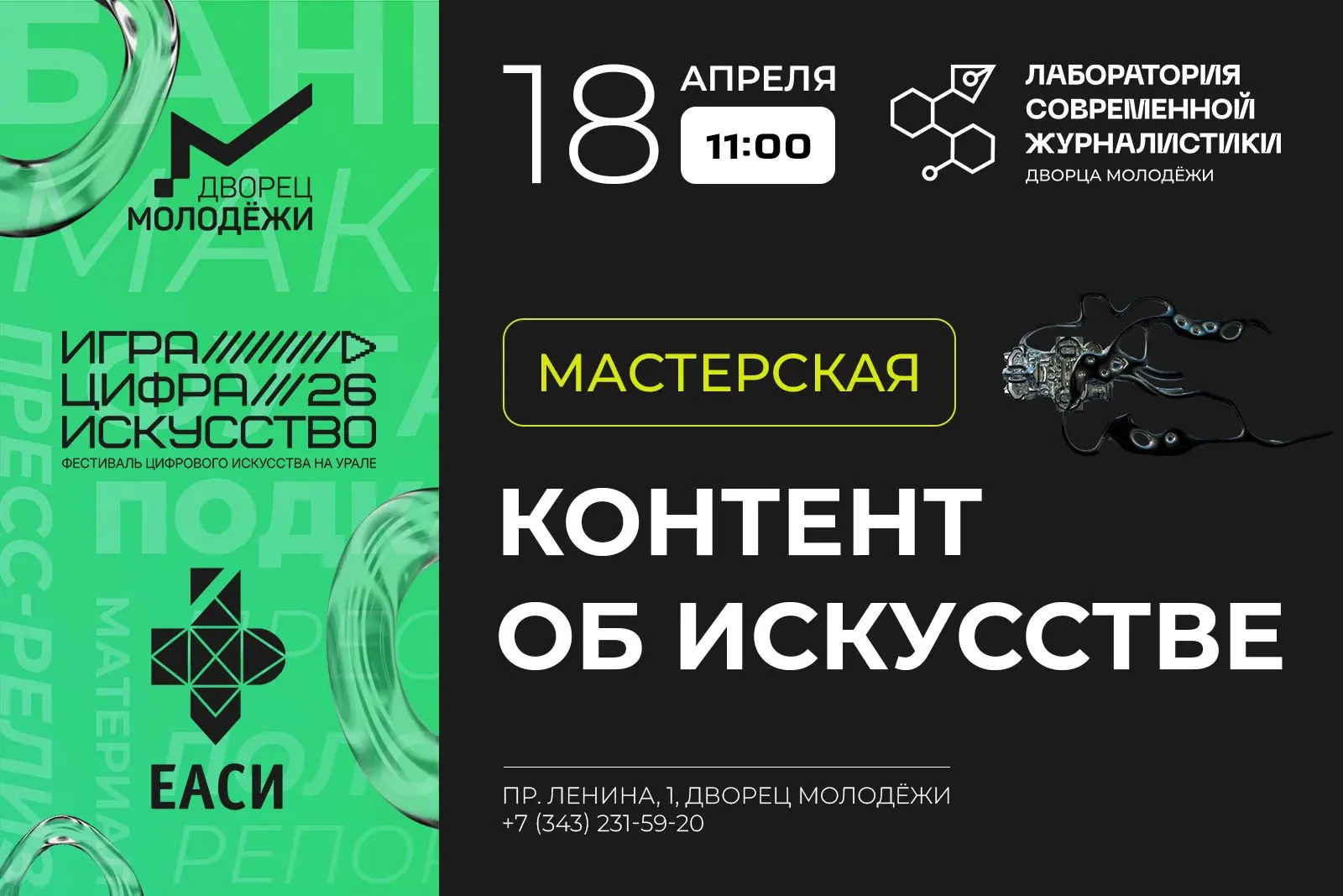18 апреля пройдёт мастерская «Контент об искусстве» от Лаборатории современной журналистики, Екатеринбургской академии современного искусства и команды фестиваля «Игра. Цифра. Искусство на Урале».