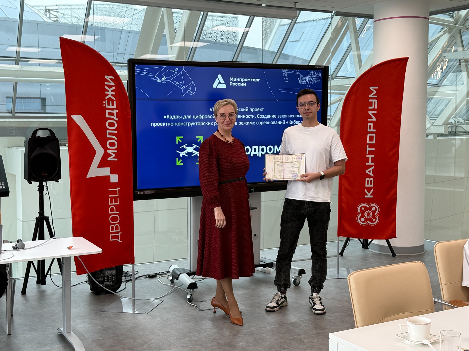 Главным событием встречи стало награждение участников конкурса – школьников, студентов и молодых специалистов в возрасте от 14 до 27 лет, успешно прошедших профессиональную аттестацию. Обучающийся технопарка Максим Титов – среди немногих подростков, получивших официальное свидетельство о профессиональной квалификации в области беспилотной авиации.