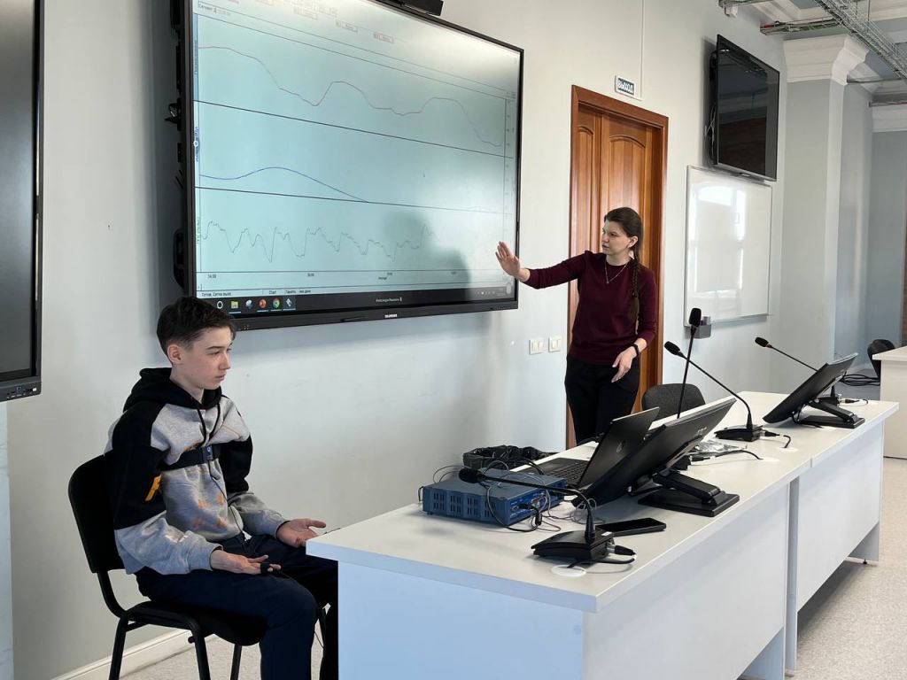 Один из примеров ребята сразу же испытали: полиграф или, как его называют в быту, детектор лжи помогает понять эмоциональное состояние пациента. Изменения пульса, дыхания, давления говорят о нервозности, переживаниях. Это проверил на себе кванторианец Глеб Рябов. Пока он отвечал на вопросы, другие обучающиеся следили за выведенными на экран показателями и подмечали все изменения в графиках.